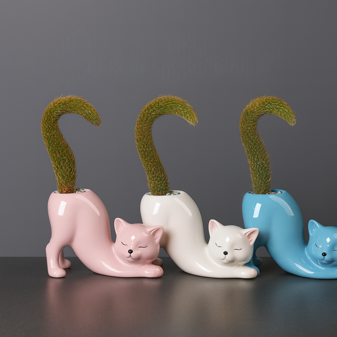 Pflanzen werden zur Kunst: Setze kleine Pflanzen oder Kakteen ein – sie formen den „Schwanz“ deiner Katze und machen jedes Stück lebendig.